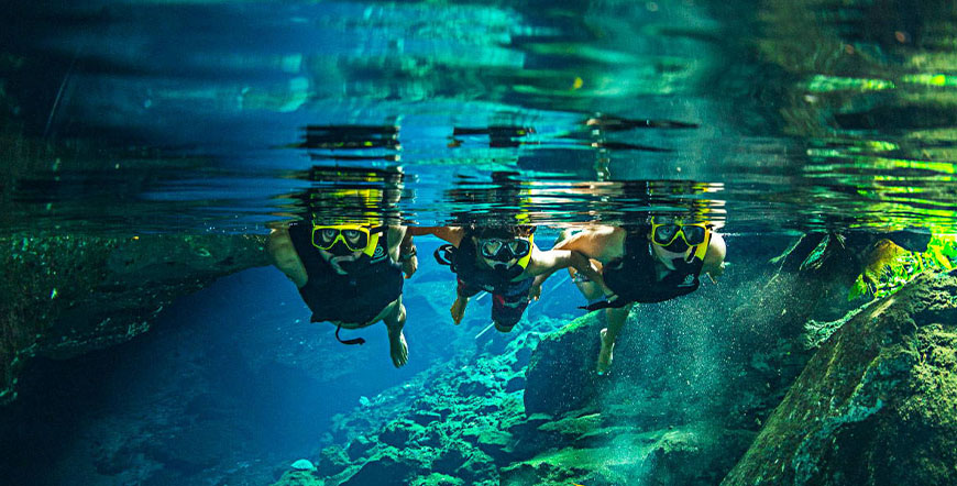 - 5. Snorkel en río subterráneo: esnórquel en el cenote Nohoch Nah Chich, la impresionante entrada principal al río subterráneo más largo del mundo: el Sistema Sac–Actun que ha sido explorado a lo largo de casi 350 km y que cuenta con asombrosas formaciones rocosas (estalactitas y estalagmitas) -Recomendado por National Geographic Snorkeler.